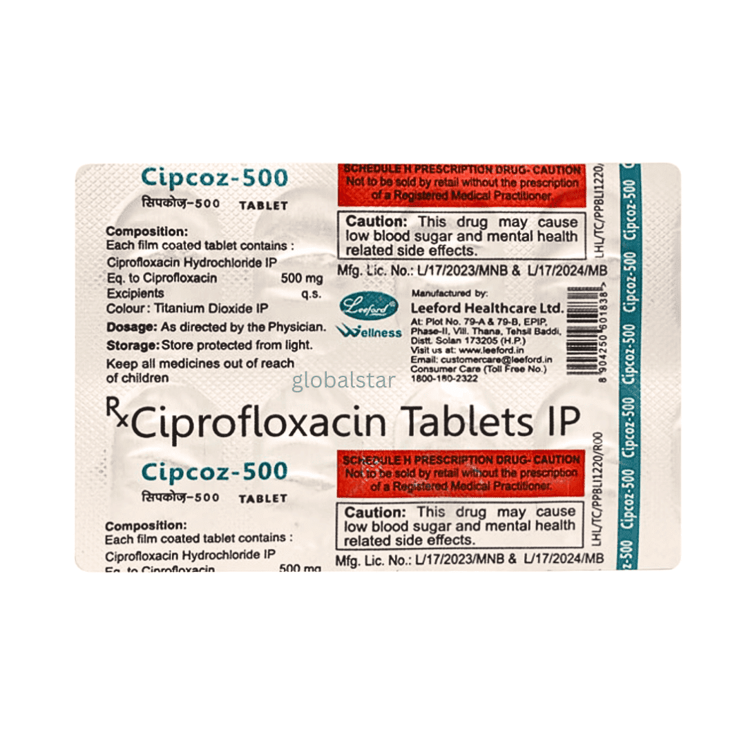 Ciprofloxacin (500mg) Tablet is a broad-spectrum fluoroquinolone antibiotic used to treat infections of the respiratory tract, urinary tract, gastrointestinal system, and skin.