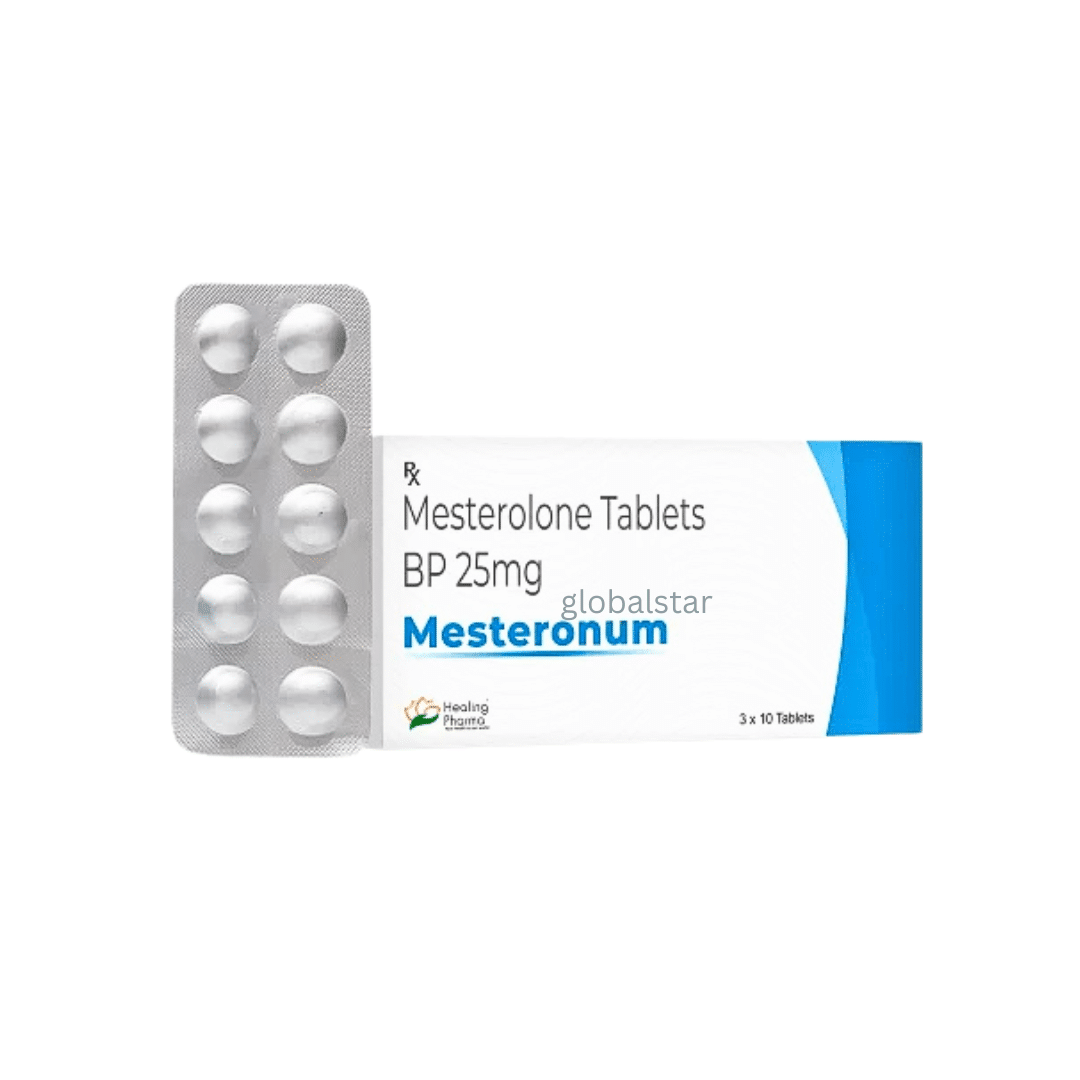 Oral androgenic tablet containing 25 mg Mesterolone for treating male hypogonadism and infertility.