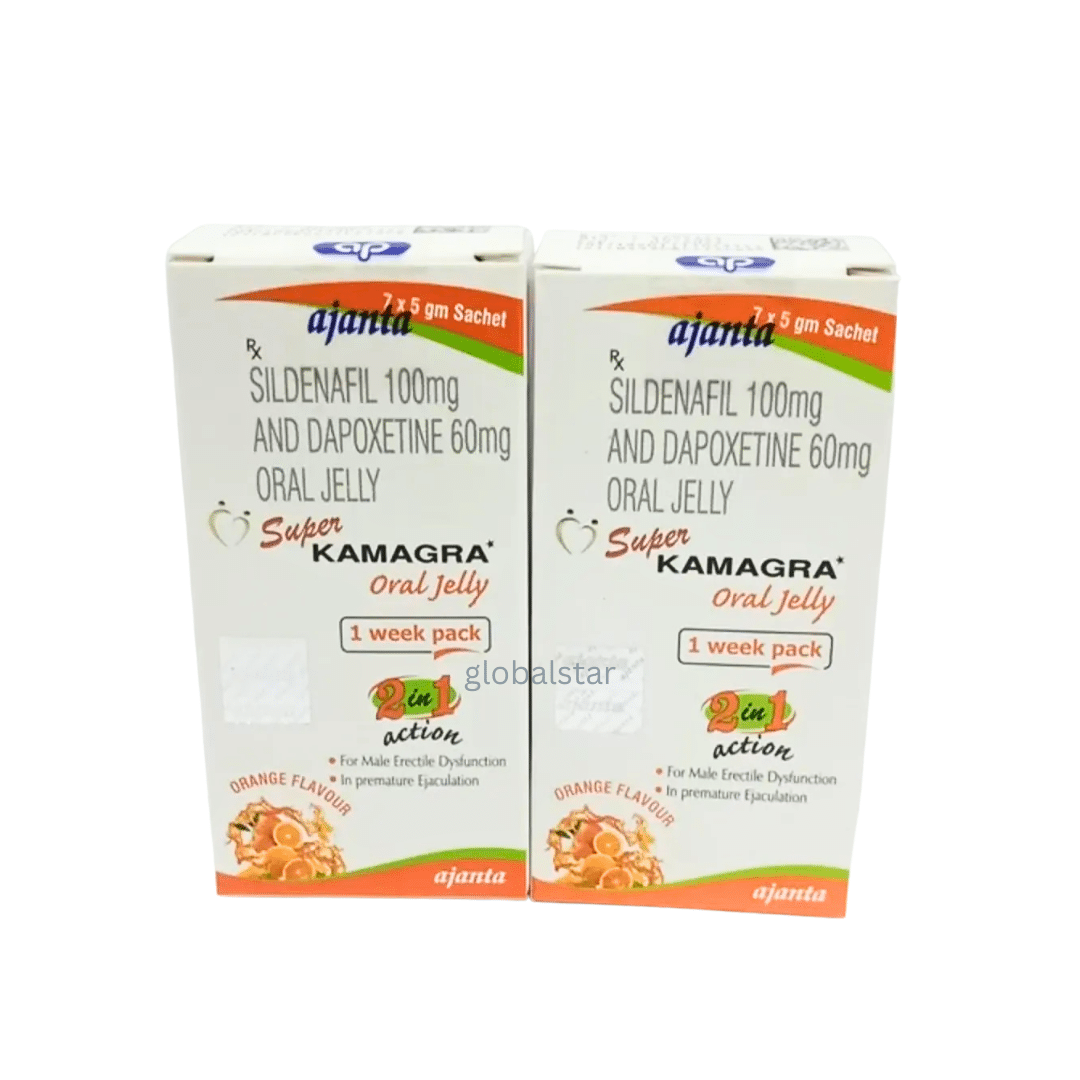 Oral jelly combining Sildenafil Citrate 100 mg and Dapoxetine 60 mg in a fast-acting sachet, for dual treatment of erectile dysfunction and premature ejaculation.
